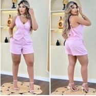 COD 5377 CONJUNTO COLETE E SHORT CREPE ROSA BEBÊ TAM G