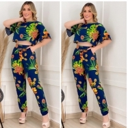 COD 4395 CONJUNTO CALÇA E CROPED AZUL MARINHO FLORAL VESTE 38 À 42