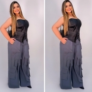 COD 5489 CONJUNTO CROPED COURO ECOLOGICO E CALÇA PANT LINHO GRAFITE COM BOLSOS VESTE 48