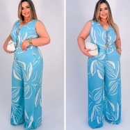 COD 5491 CONJUNTO CALÇA PANT E CROPED COM AMARRAÇÕES EM VISCOSE AZUL COM ESTAMPAS VESTE 46 E 48