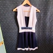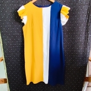 COD 0224 VESTIDO EM OXIFORD AZUL MARINHO BRACO MOSTARDA COM ZIPER NAS COSTA TAM M