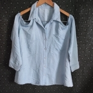 COD 0563 CAMISA FEMININA EM VISCOLINHO AZUL CLARO OMBROS VAZADOS BOLSO E BOTÕES TAM M