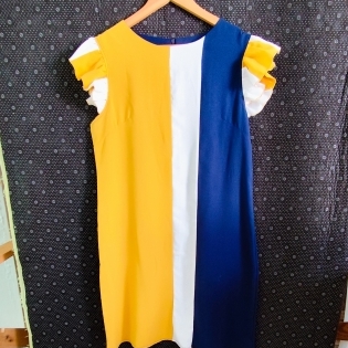 COD 0224 VESTIDO EM OXIFORD AZUL MARINHO BRACO MOSTARDA COM ZIPER NAS COSTA TAM M
