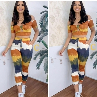 CONJUNTO CALÇA COM ELÁSTICO NA CINTURA E BARRA AMARRAÇÕES DO MESMO TECIDO E CROPED ELÁSTICO NAS COSTAS E MANGUINHAS EM MALHA TIE DYE MARROM TOM SOBRE TOM VESTE 36 À 40