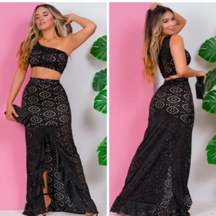 CONJUNTO EM LESE FORRADO SAIA SEREIA COMFENDA FOLHADA NA FRENTE E CROPED OMBRO UNICO COM BOJO VESTE 36 À 40 DISPONIVEL NAS COR PRETA
