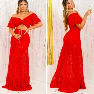 CONJUNTO EM BENGALINE E RENDA SHORT SAIA E CROPED CIGANINHA COM AMARRAÇÕES NO BUSTO VESTE 40 À 42 DISPONIVEL NA COR VERMELHO