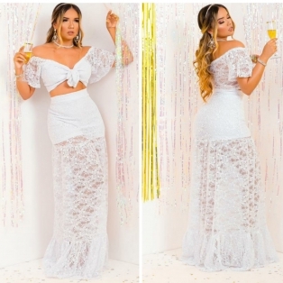 CONJUNTO EM BENGALINE E RENDA SHORT SAIA E CROPED CIGANINHA COM AMARRAÇÕES NO BUSTO VESTE 40 À 42 DISPONIVEL NA COR BRANCO