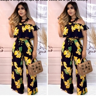 CONJUNTO EM CREPE DE SEDA AZUL MARINHO FLORAL AMARELO CALÇA PANTA CINTURA ALTA E CROPED OMBRO A OMBRO VESTE 38 À 42