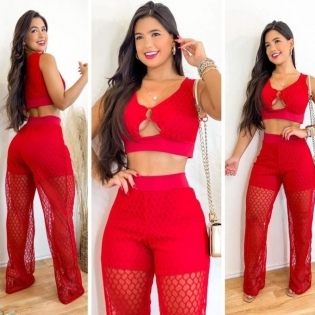 CONJUNTO EM MALHA GROSSA LISA SUPLEX VERMELHA CALÇA COM ARRASTÃO E CROPED COM BOJO DECOTE VAZADO VESTE 42 À 44