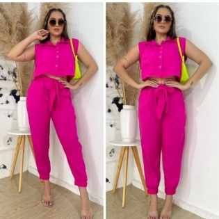 CONJUNTO EM VISCOSE ENCORPADA VISCOLINHO NA COR ROSA PINK CROPED MANGA REGATA BOTÕES CALÇA JOGGER ELASTICO NA CINTURA E NAS BARRAS AMARRAÇÃO E BOLSO FACA VESTE 38 À 42