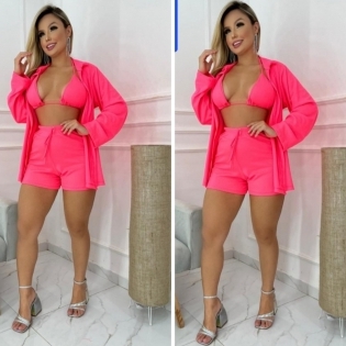 CONJUNTO TRIO EM MALHA RIBANA SUTIÃ COM BOJO+SHORT+KIMONO VESTE 38 AO 44 DISPONIVEIS NAS CORES NEON VERDE PINK E ALARANJADO