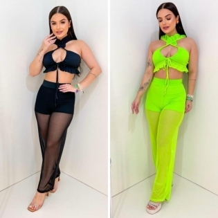 CONJUNTO SHORT E CROPED SEM BOJO EM MALHA CANELADA CALÇA EM TULE DISPONIVEL NAS CORES VERDE NEON E PRETO VESTE 40 AO 44