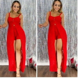 CONJUNTO EM MALHA ARRASTÃO VERMELHO SANGUE MAXIBLUSA SEM BOJO E SHORT TAM G