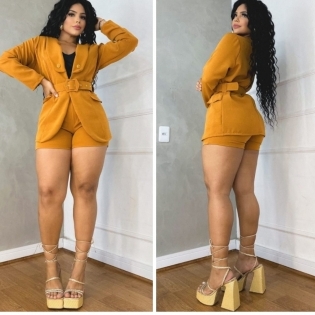 CONJUNTO EM FINA ALFAIATARIA MICROFIBRA NA COR MOSTARDA DETALHES DOURADORAS BLASER SHORT E CINTO TAM M