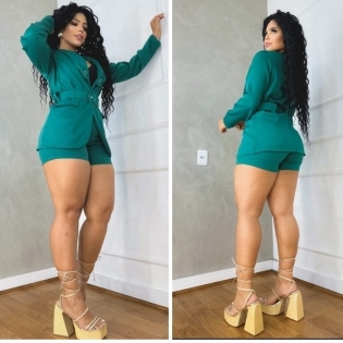 CONJUNTO EM FINA ALFAIATARIA MICROFIBRA NA COR VERDE MUSGO DETALHES DOURADORAS BLASER SHORT E CINTO TAM M