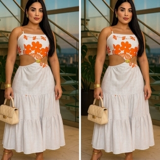 COD 5401 VESTIDO FLORAL CREPE BRANCO E LARANJA AMARRAÇÃO NAS COSTAS ELASTICO NA CINTURA TAM 38 A 42