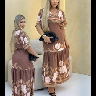 COD 5405 VESTIDO LONGO CREPE MARROM FLORAL ELASTICO NAS COSTAS DECOTE V VESTE 38 AO 42