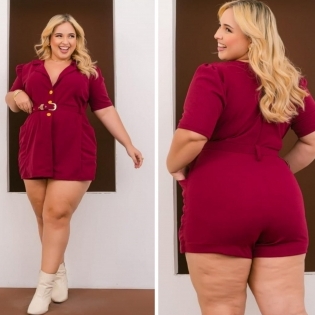 COD 5426 MACAQUINHO COM CINTO BOLSOS ALCINHAS ILHÔS DOURADOS MALHA SCULBA VINHO VESTE 50 À 52