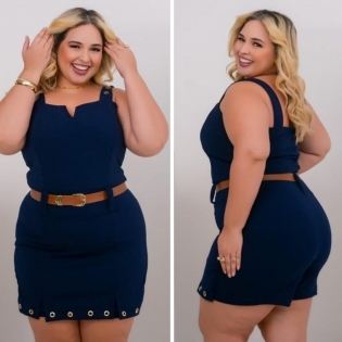 COD 5427 MACAQUINHO COM CINTO BOLSOS ALCINHAS ILHÔS DOURADOS MALHA SCULBA MARINHO VESTE 50 À 52