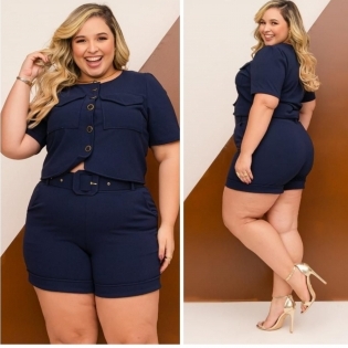 COD 5429 CONJUNTO SHORT BLUSA CINCO BOTÕES E BOLSOS MALHA SCULBA MARINHO VESTE 50 AO 52