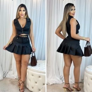COD 5444 CONJUNTO CROPED E SHORTSAIA ALFAIATARIA PRETO ZIPER NA LATERAL BOTÕES E CINTO TAM M