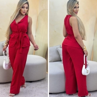 COD 5446 CONJUNTO CALÇA PANT COLETE E FAIXA EM CREPE LISTRADO VERMELHO BOLSOS E ELESTICO NO CÓS TAM G