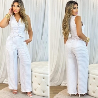 COD 5448 CONJUNTO CALÇA PANT COLETE COM BOTÕES BOLSOS E ELESTICO NO CÓS CREPE LISTRADO BRANCO TAM G