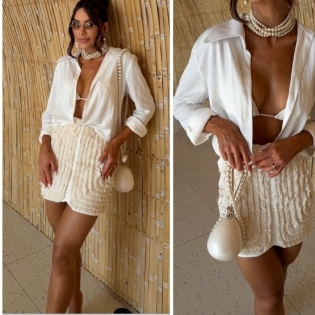 COD 5509 CONJUNTO SHORT COM ELASTICO E BOLSOS BLUSA MALHA RUGA BRANCA COM BOTÕES TAM M